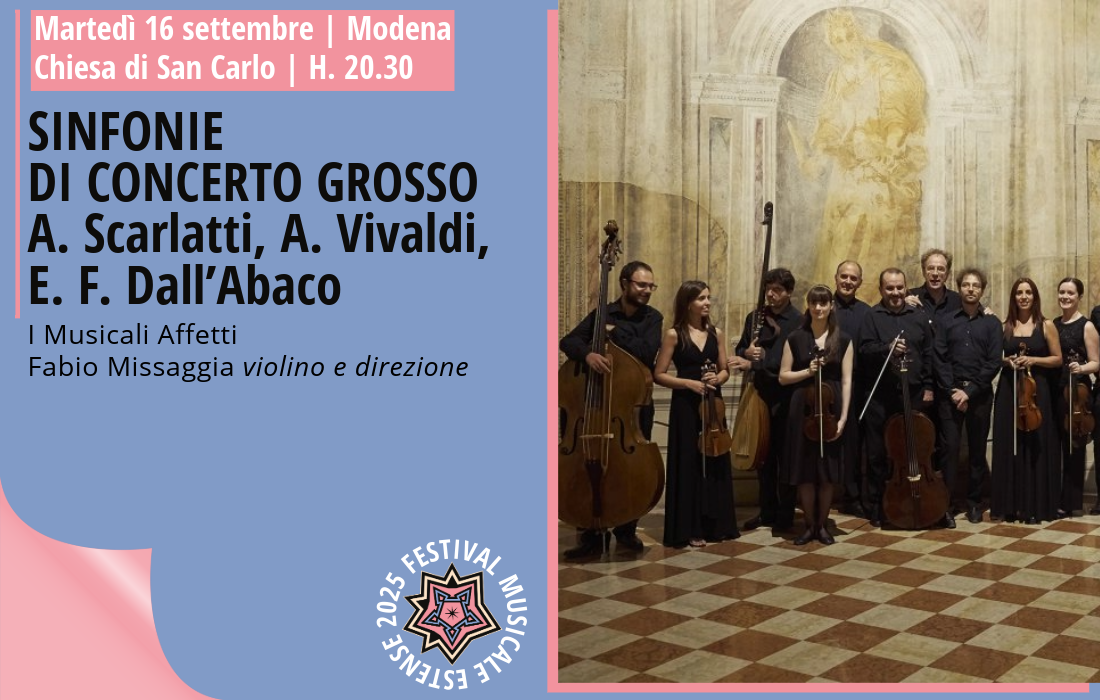 Chiesa di San Carlo modenain occasione di "Grandezze & Meraviglie 2025 - XVIII Festival Musicale Estense" Martedì 16 settembre, Modena Chiesa di San Carlo, ore 20.30 SINFONIE DI CONCERTO GROSSO A. Scarlatti, A. Vivaldi, E.F. Dall'Abaco I MUSICALI AFFETTI Matteo Zanatto, Alessia Turri, Isobel Cordone, Matteo Rozzi, Laxman Martin violini Giovanni Dalla Vecchia, Martina Pettenon viole Carlo Zanardi, Francesco […]