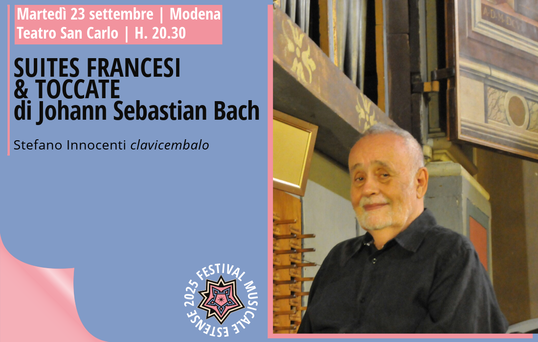 Teatro San Carlo Modenain occasione di “Grandezze & Meraviglie 2025 – XVIII Festival Musicale Estense” Martedì 23 settembre, Modena Teatro San Carlo, ore 20.30 SUITES FRANCESI & TOCCATE Di Johann Sebastian Bach Stefano Innocenti clavicembalo --- JOHANN SEBASTIAN BACH (1685-1750) Suite francese I in re minore BWV 812 Allemande, Courante, Sarabande, Menuet I/II, Gigue Suite francese III […]